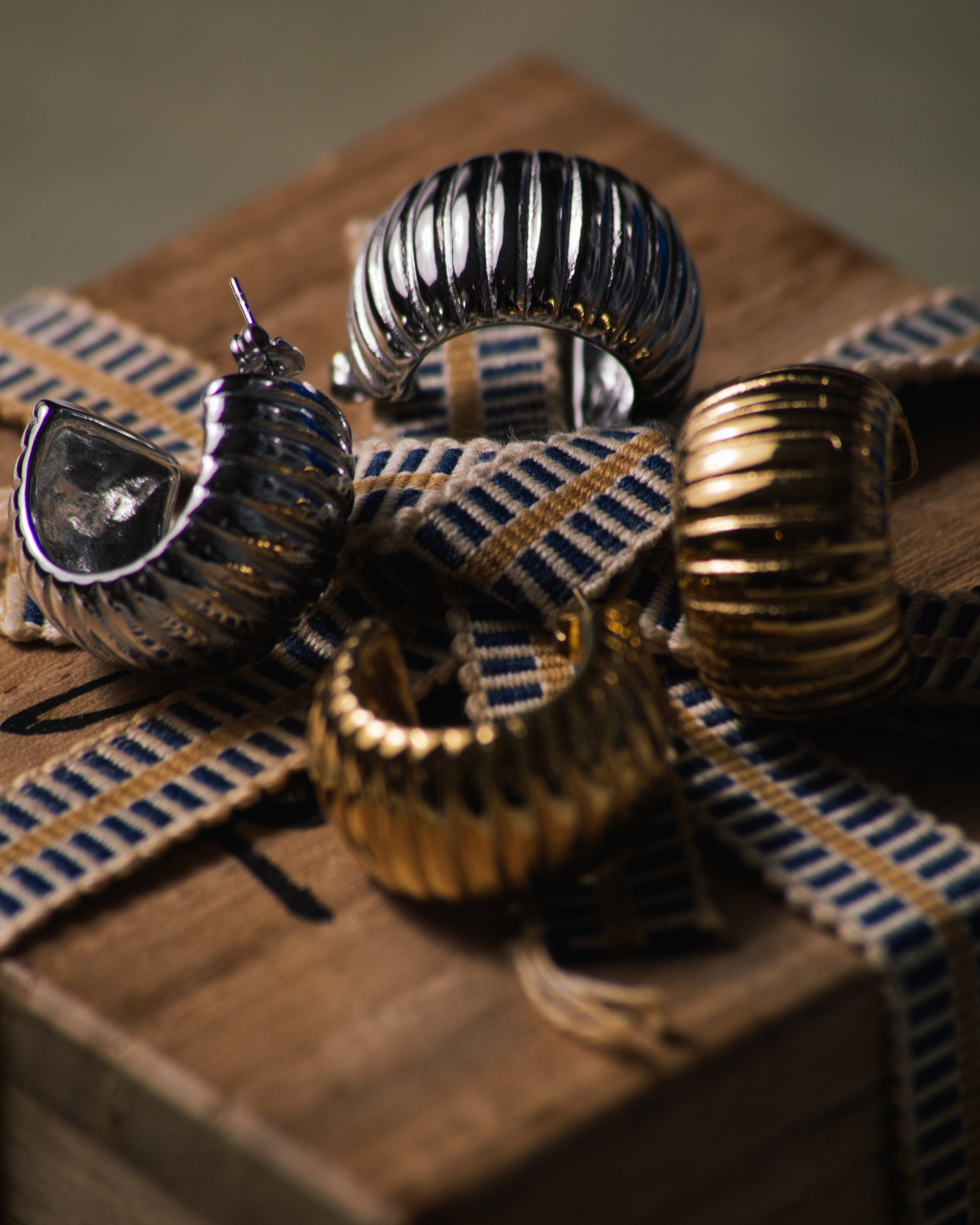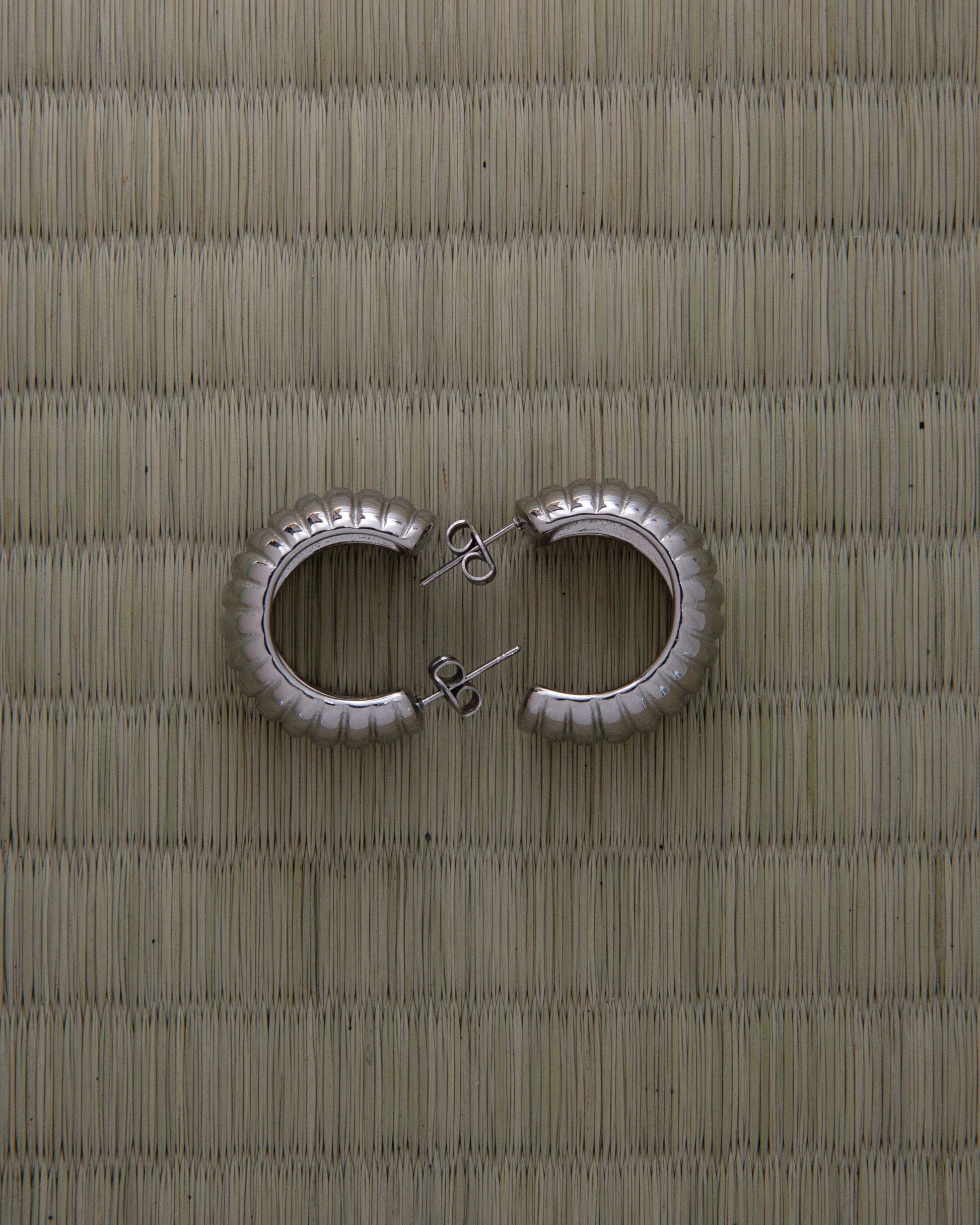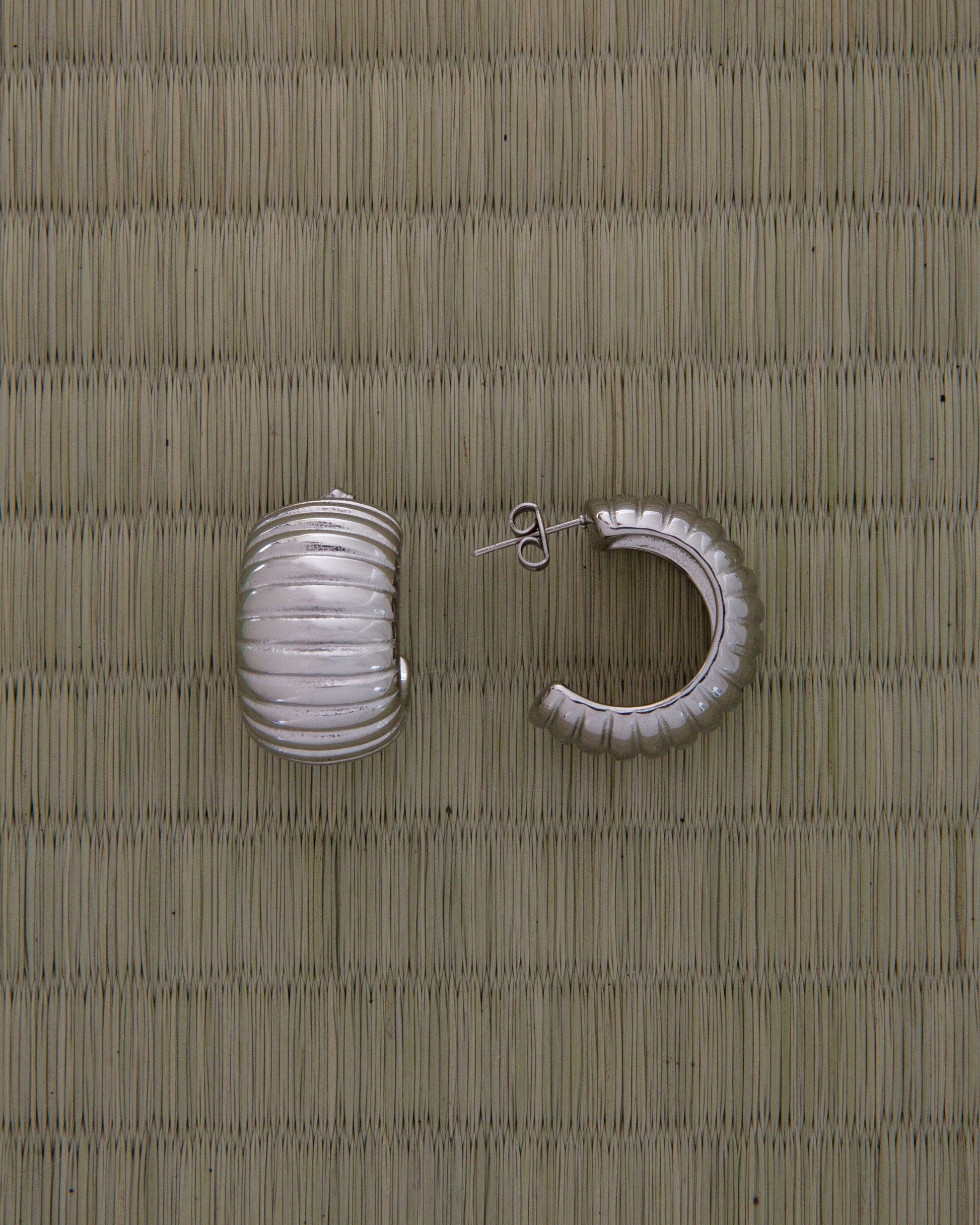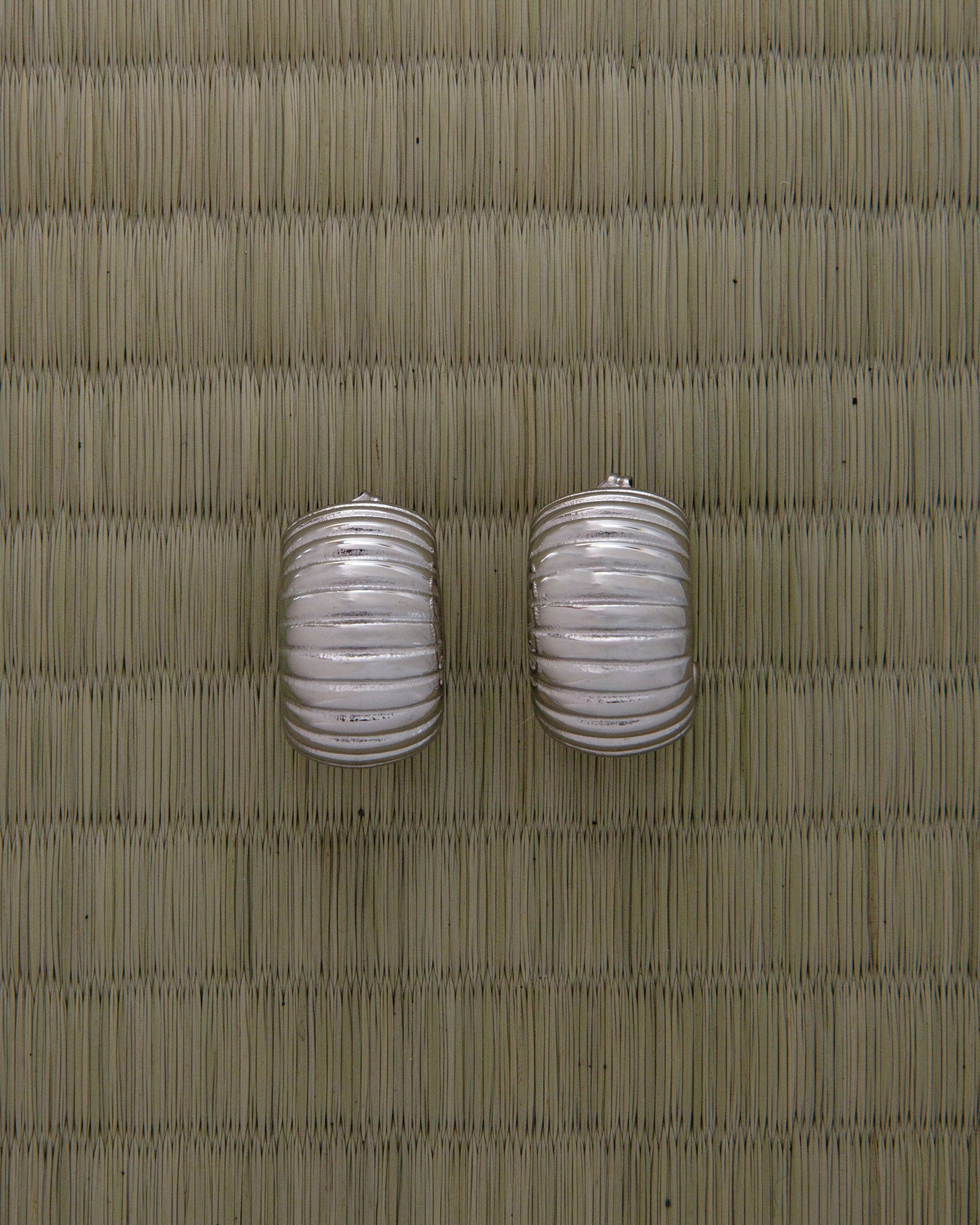 ころんとしたフォルムに、横縞の立体ラインが映えるピアス。